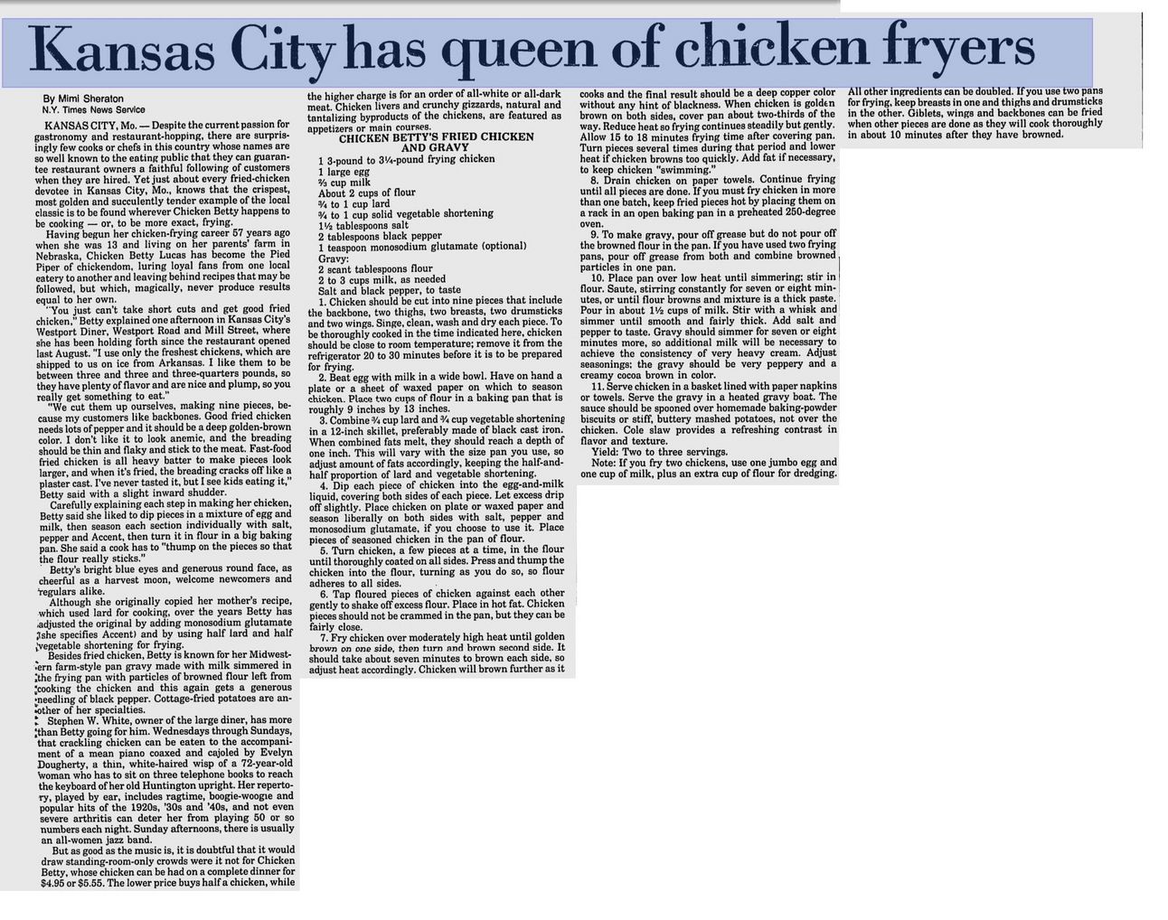 I was discussing favourite fried chicken restaurants with my parents (Top four Shurin family conversations: food we have eaten, food we are currently eating, places we will travel, things we will eat at those places). My mom dropped the bombshell, ‘well, of course we like all those chicken restaurants, because they’re all Chicken Betty’. Which is one of those sentences that makes perfect sense if you’re from Kansas City and is totally befuddling if you aren’t.